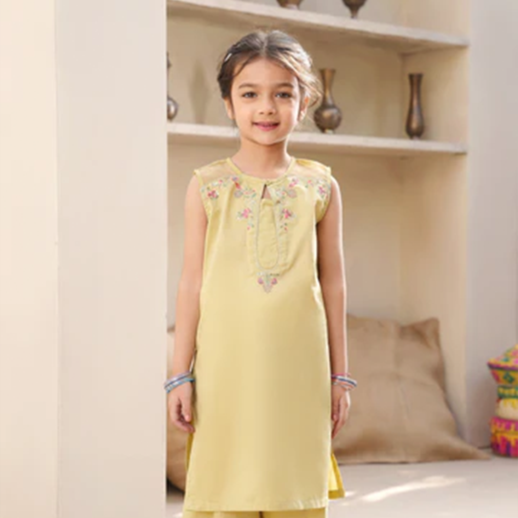 The Green Embroidered Kameez & Trousers set is a stylish and elegant choice for young girls, perfect for festive occasions, family gatherings, and cultural celebrations. Crafted from lightweight and breathable cambric fabric, this sleeveless kameez ensures comfort while maintaining a refined and traditional look. The refreshing green color adds vibrancy and charm, making it a standout addition to any ethnic wardrobe.